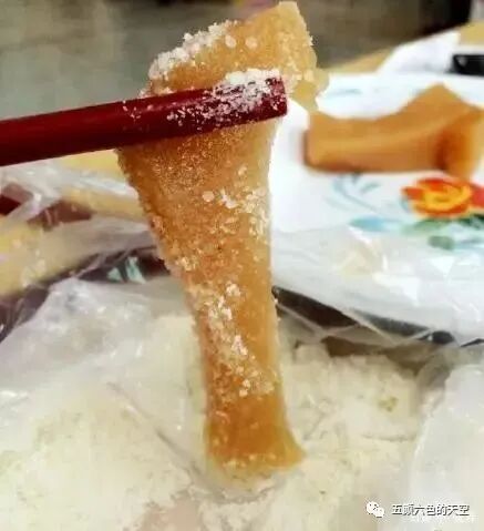 栀粽,吃时用纱线或小刀切割成小片,沾上砂糖,入口甘香爽口,超好吃
