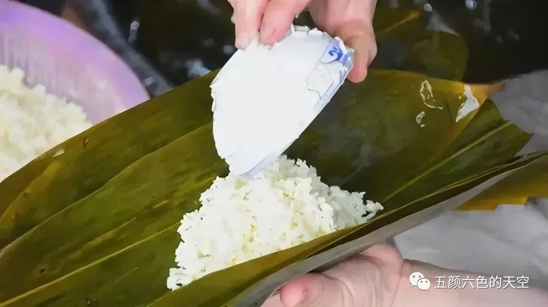 用传统糕子模具将粽叶铺上,将糯米饭放入模具中压实