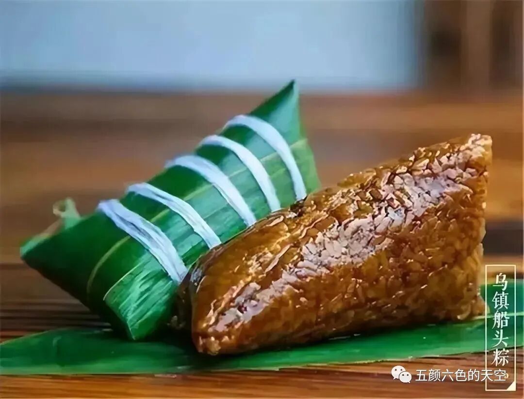 乌镇船头粽是具有浓郁地方特色的一道小吃。由于该粽子比嘉兴粽子消瘦,比湖州粽子肥胖,又因其头翘尾平,形态如船,故被誉为“船头粽”,寓意“财头粽”或“彩头粽”。