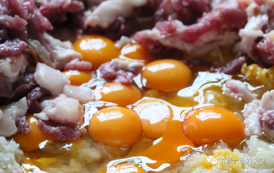 糯米摊凉后,一斤糯米四个土鸡蛋,三两五花肉,八克盐的配方倒入盘中搅拌