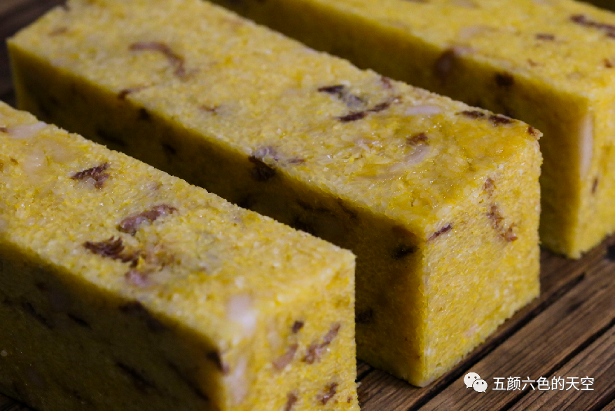 蒸熟后脱模切成方块,香糯可口,非常适合老人小孩吃,凉后可切片煎炸外酥里糯