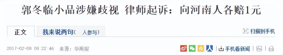 甚至有律师将郭冬临告上了法庭,要求郭冬临赔偿每位河南人1元精神损失费。
