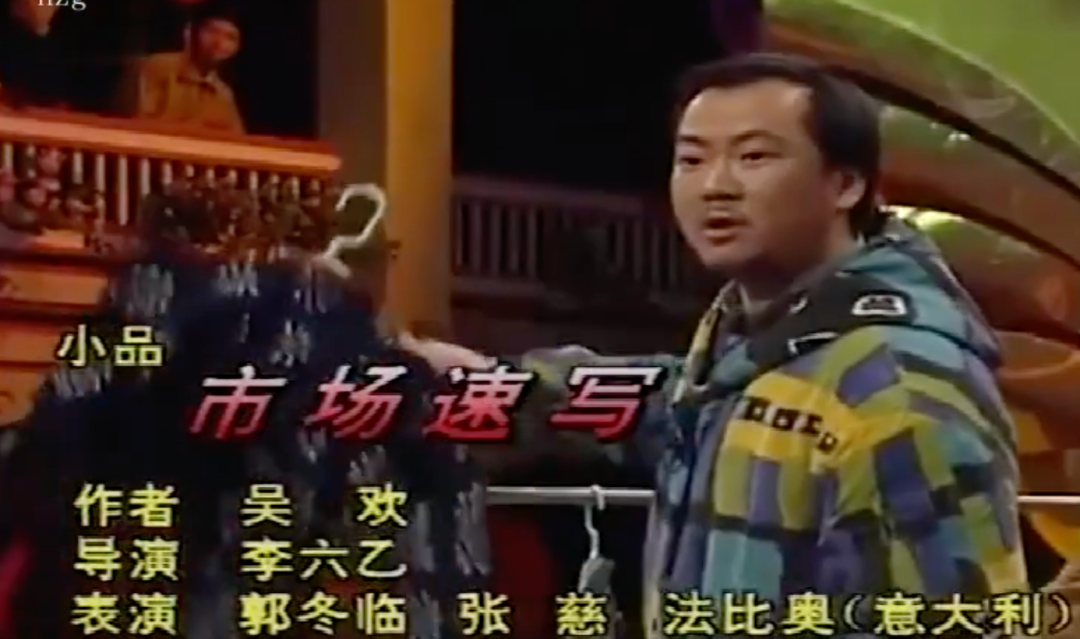 舞台上,他穿着一件黄绿相间的外套,发量还很多,台词里穿插着几个不太标准的英文单词,出演了小品《市场速写》。