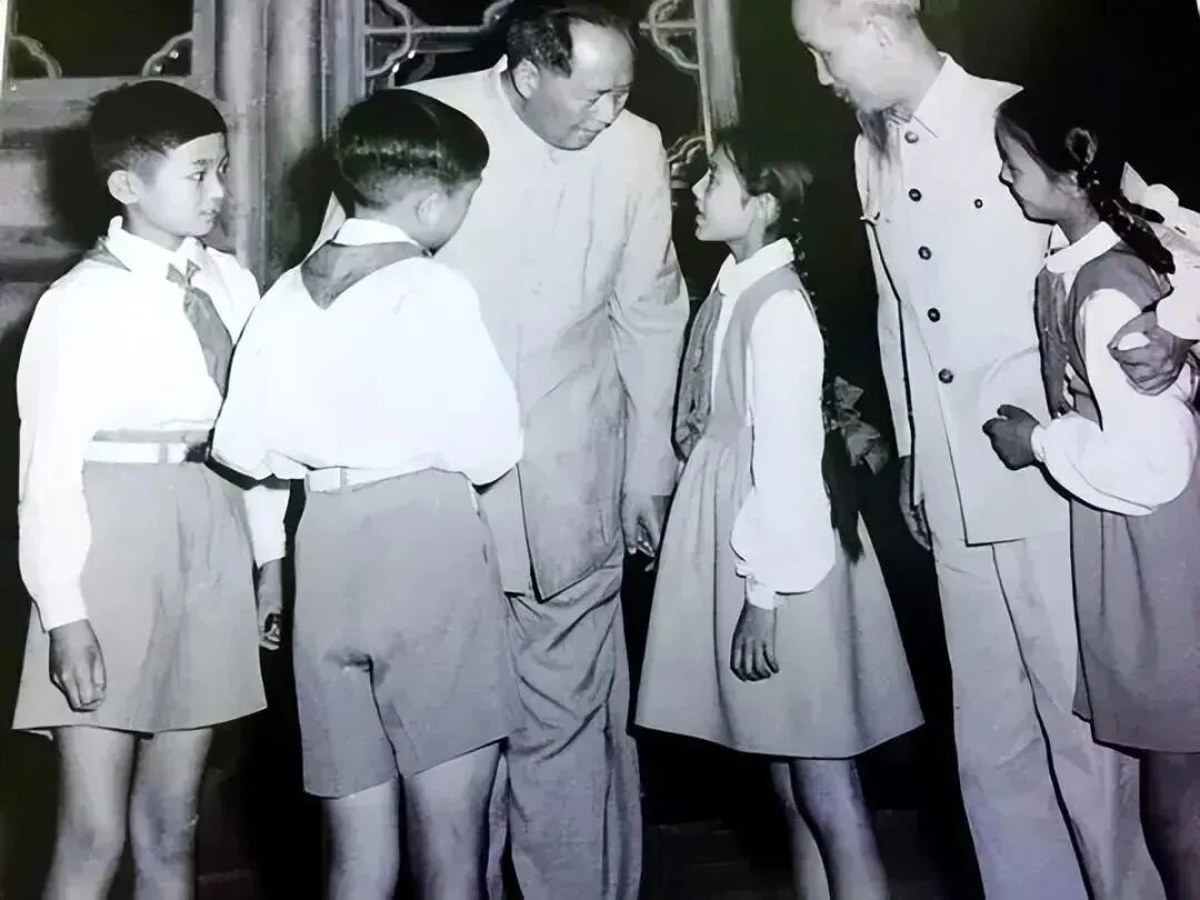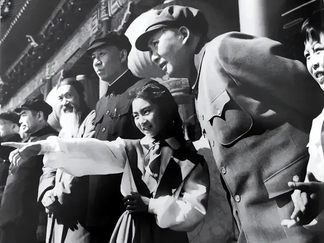 原来,张筠英九岁就给毛主席献花,是同学们眼中的小明星。从1951年开始。每年的国庆和五一庆祝游行中,都有一男一女两名少先队员,跑过金水桥,登上天安门城楼,去给毛主席献花。这些孩子,都经过了千挑万选,并由当时的北京市市长彭真亲自确定。一张经典的《毛主席和少年儿童》的照片上的女孩子就是张筠英。
