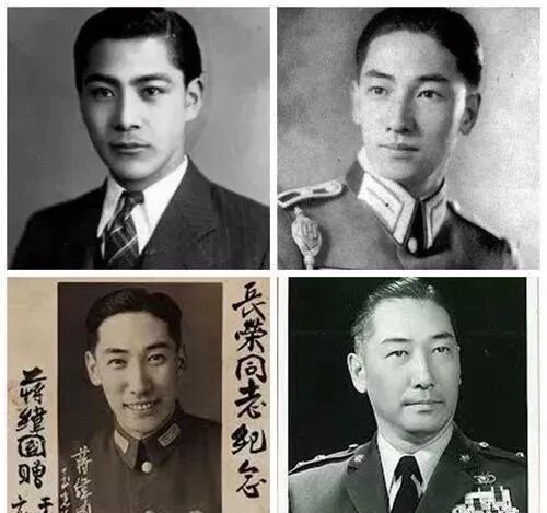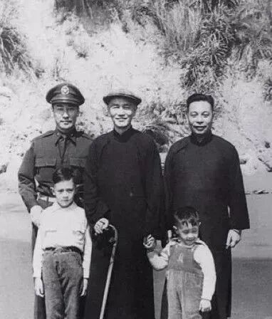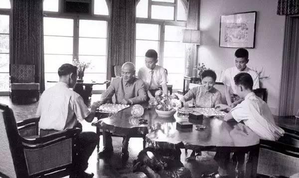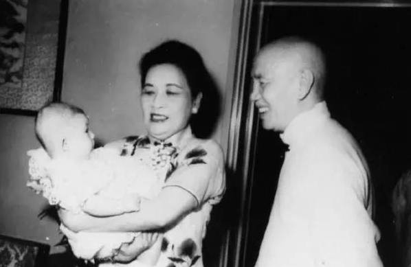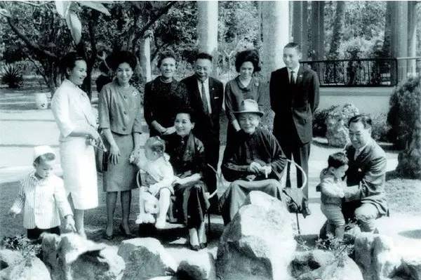 蒋介石与宋美龄端坐中间,右边蹲着抱着孩子的为蒋纬国,后排右起为蒋经国的长公子蒋孝文、蒋孝文的妻子徐乃锦、蒋经国、蒋方良、蒋纬国的夫人丘爱伦、蒋经国的女儿蒋孝章。