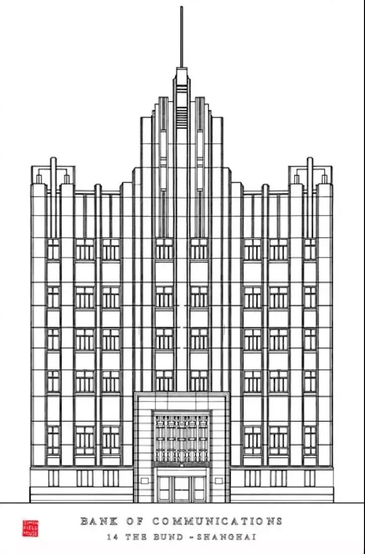 14号建筑原是文艺复兴风格「德华银行」大楼,一战后由「交通银行」接管,1937年委托匈牙利「鸿达洋行」重新设计。建筑采用当时新潮的「装饰艺术」风格,强调垂直线条,中轴对称,顶部中央加高两层作塔状造型。底层及入口以黑色大理石饰面,质朴其外,精美其中。