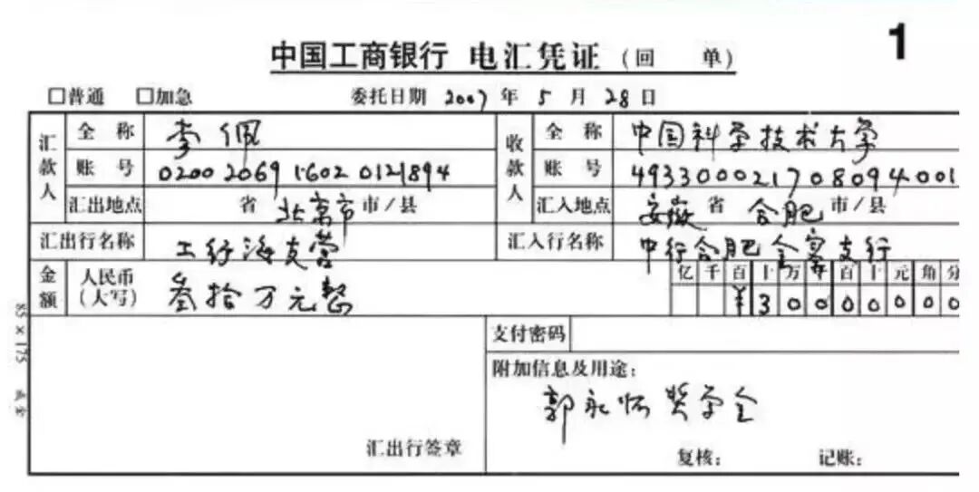 李佩给“郭永怀奖学金”汇款的支票