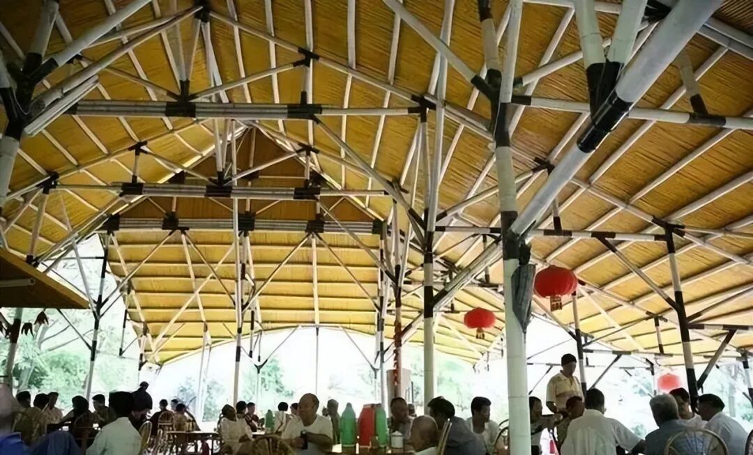 这是竹子茅草搭成的亭子。所有竹子的节点都用油漆做了一个描绘,让人感觉像是钢结构。但事实上支撑起整个亭子的,只是竹子而已。