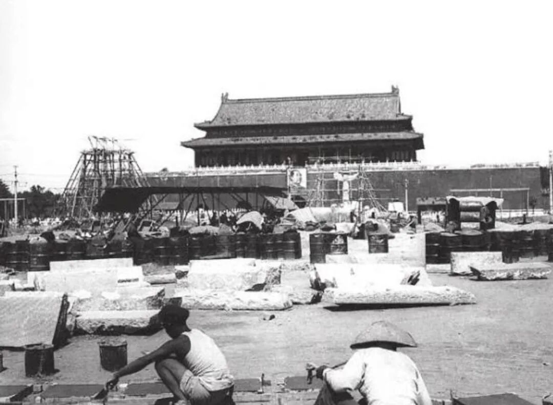 六千多名共青团员、青年学生踊跃参加清理天安门广场的劳动。当事人回忆,当时的天安门城楼上鸽子粪、蒿草有一米高,5.4万平方米的广场上有几百个大坑,垃圾成山,这一切,都需要在开国大典前搞定。