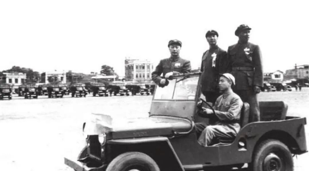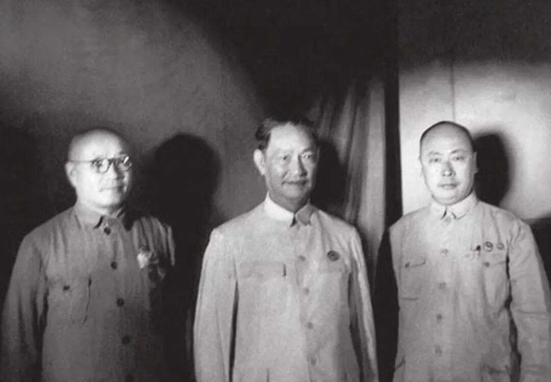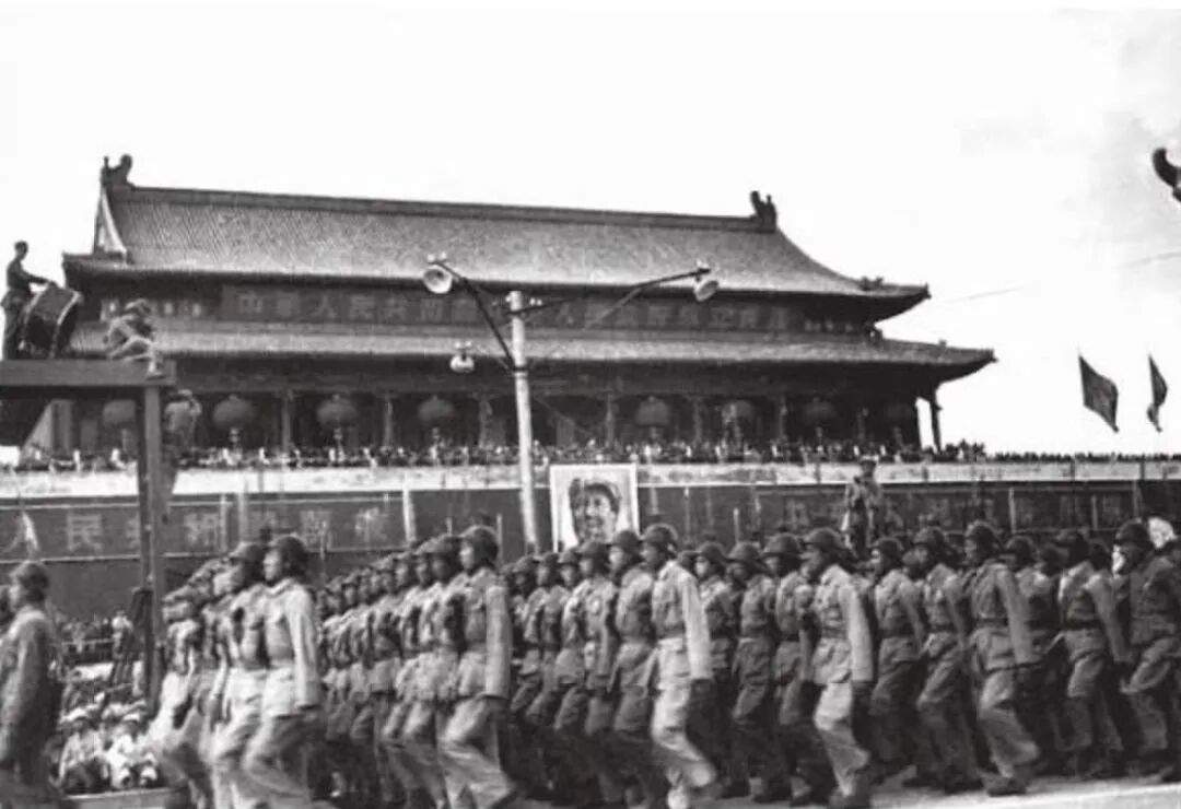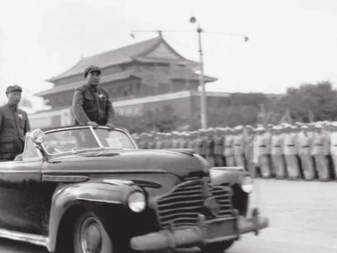 1949年10月1日,下午1时,华北军区司令员、开国大典总指挥聂荣臻(左一),二十兵团司令、开国大典阅兵办公室主任杨成武(左二),华北军区参谋长、开国大典阅兵指挥部成员唐延杰(左三)检查阅兵部队集结准备情况。