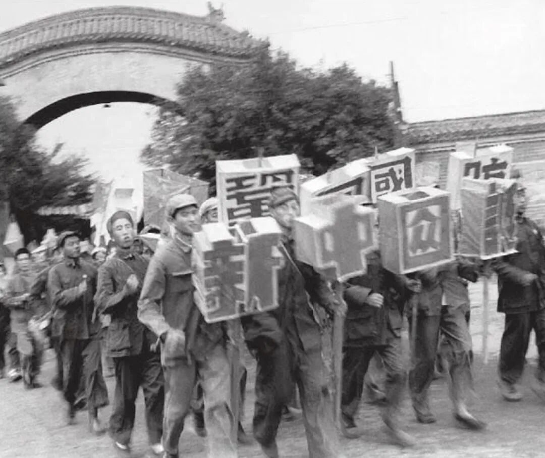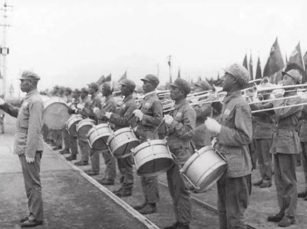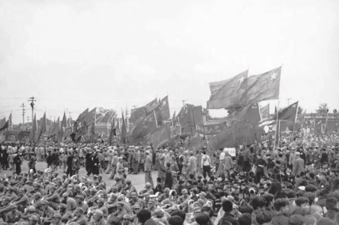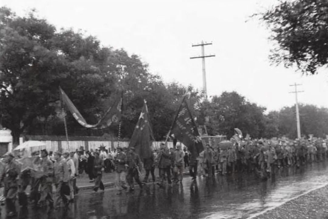 这天,高悬毛主席、朱总司令肖像的彩车和军乐队,是游行队伍的前导。