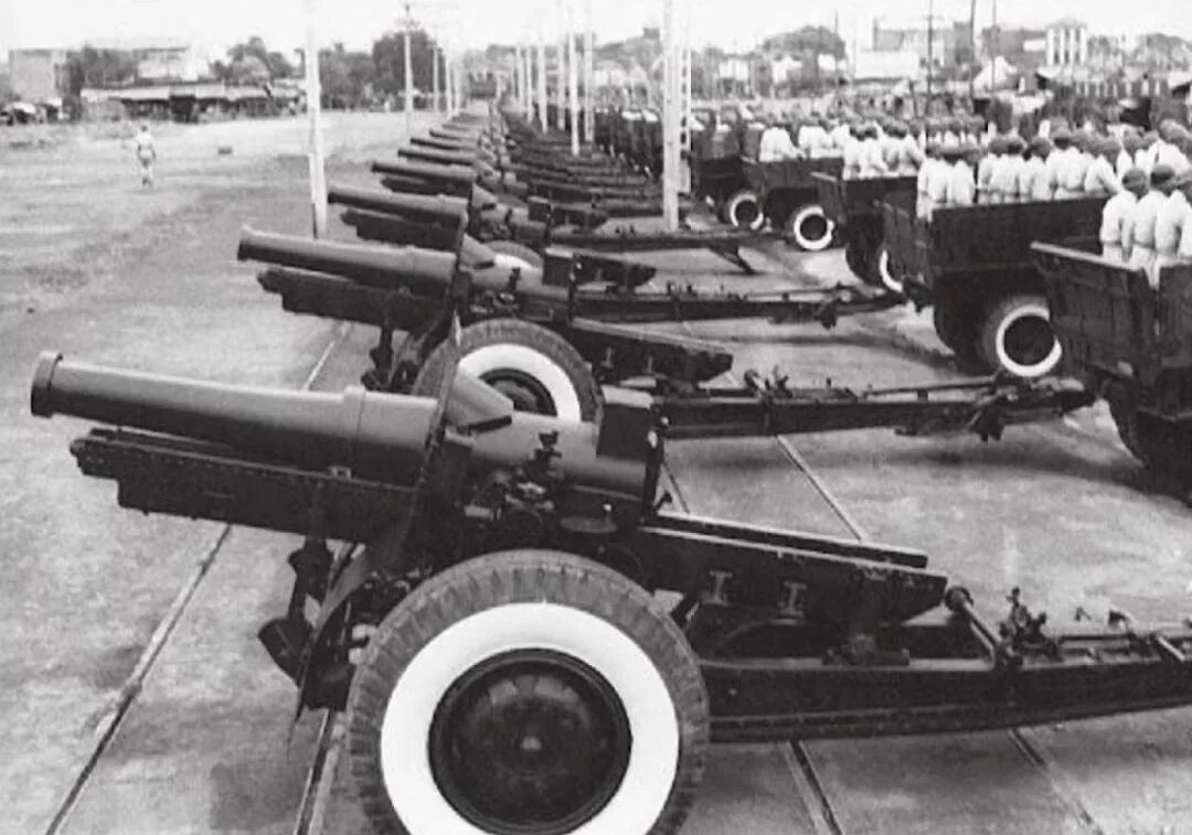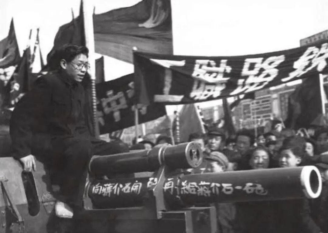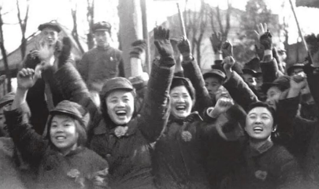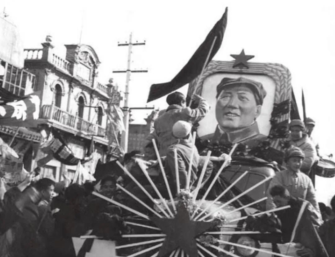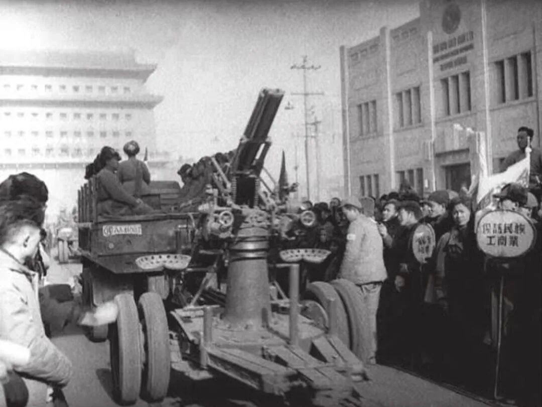 这张照片是人民解放军机械化部队从夹道欢迎的群众中穿过。一个市民跳上了炮车,在炮筒上写下:“向蒋介石开炮。再给蒋介石一炮”。