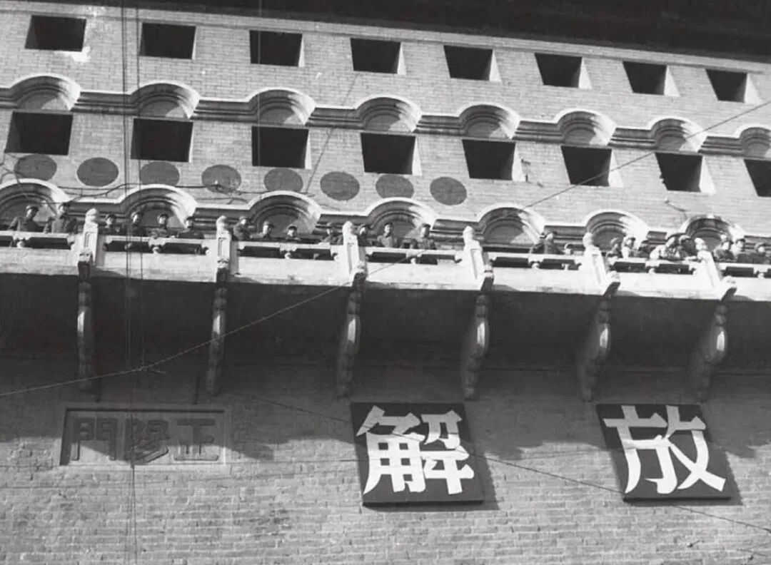 箭楼上,华北野战军、第四野战军和北平军管会领导在检阅入城部队。