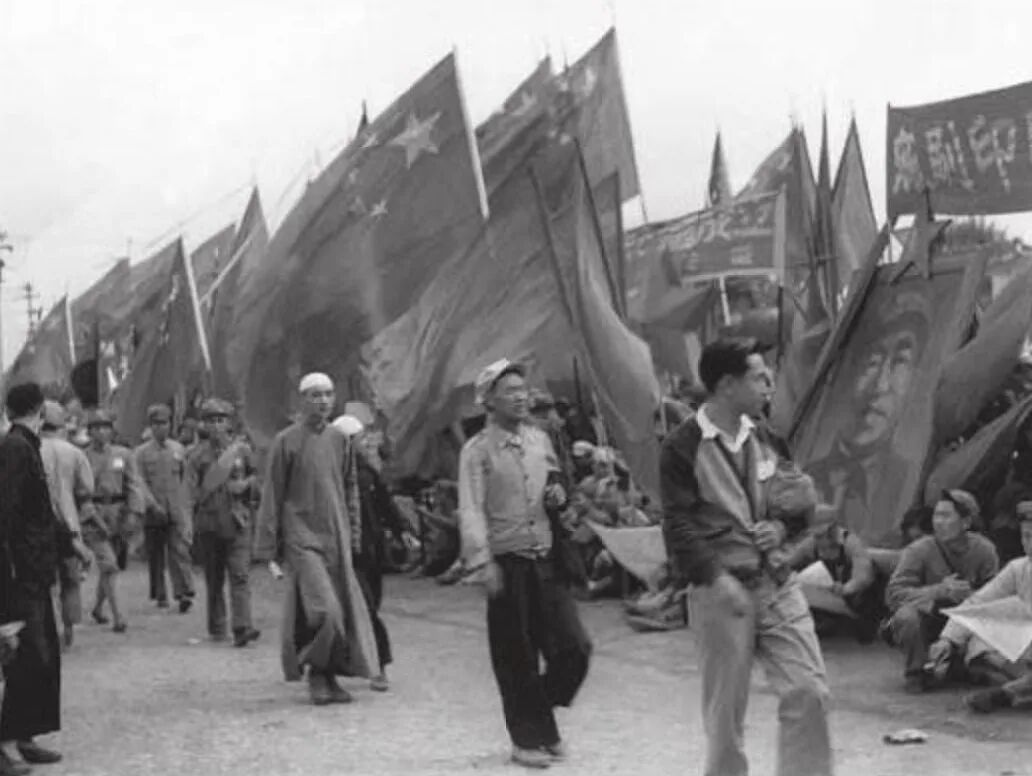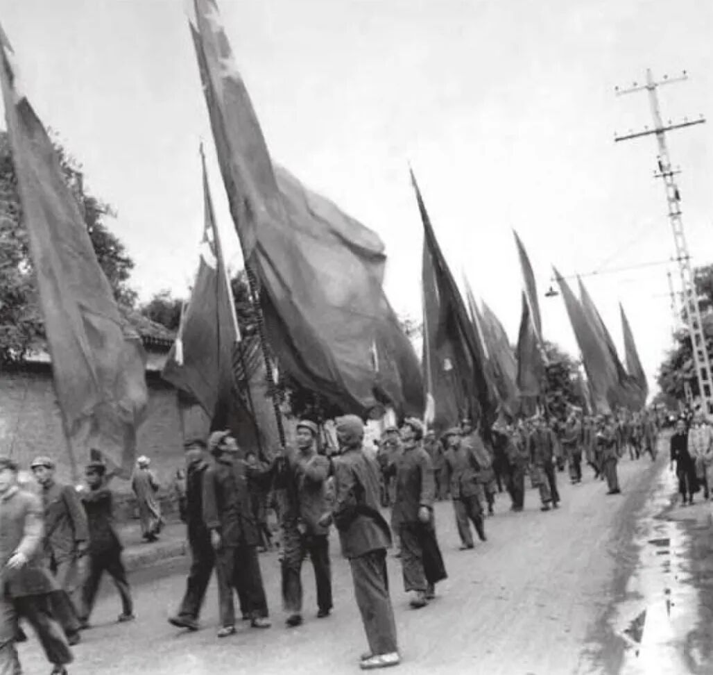 华北大学的师生们冒雨举着庆祝新中国成立的五星红旗和各种标语向天安门广场集合。