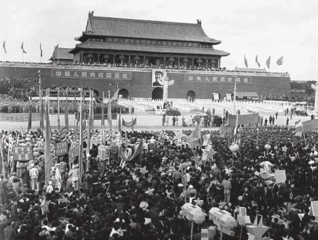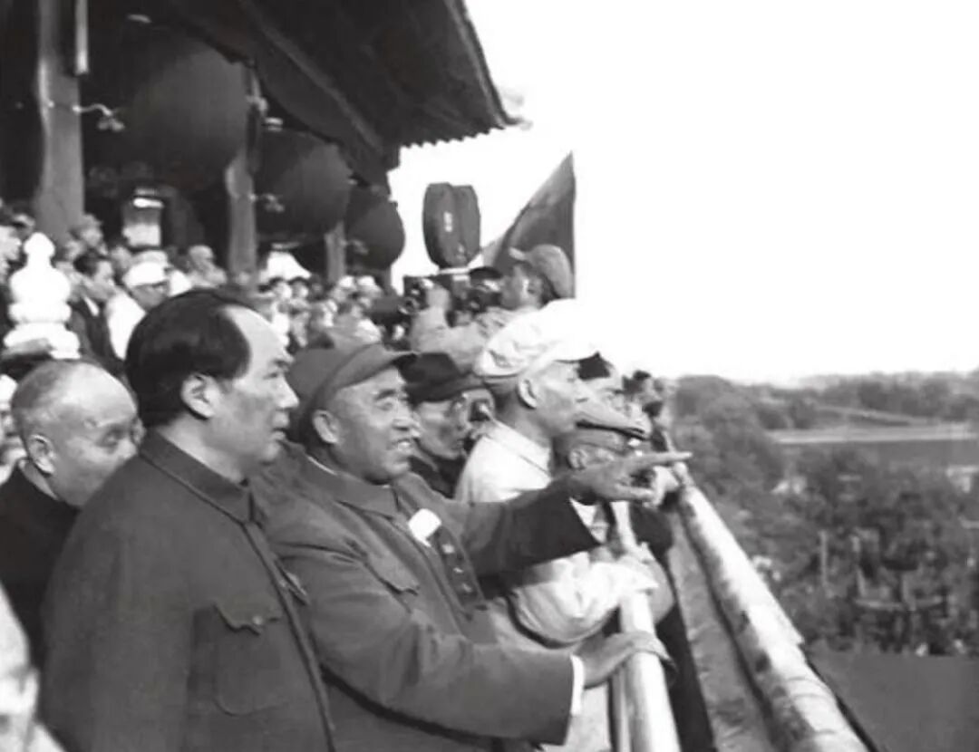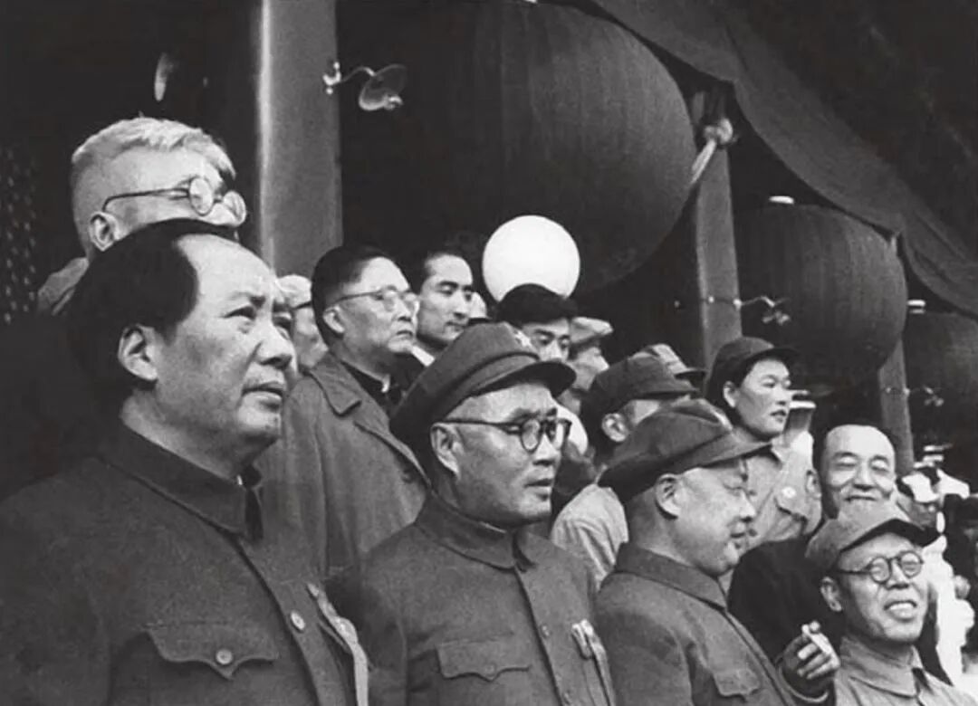 天安门城楼上,前排左起毛主席、刘伯承、陈毅、李立三。