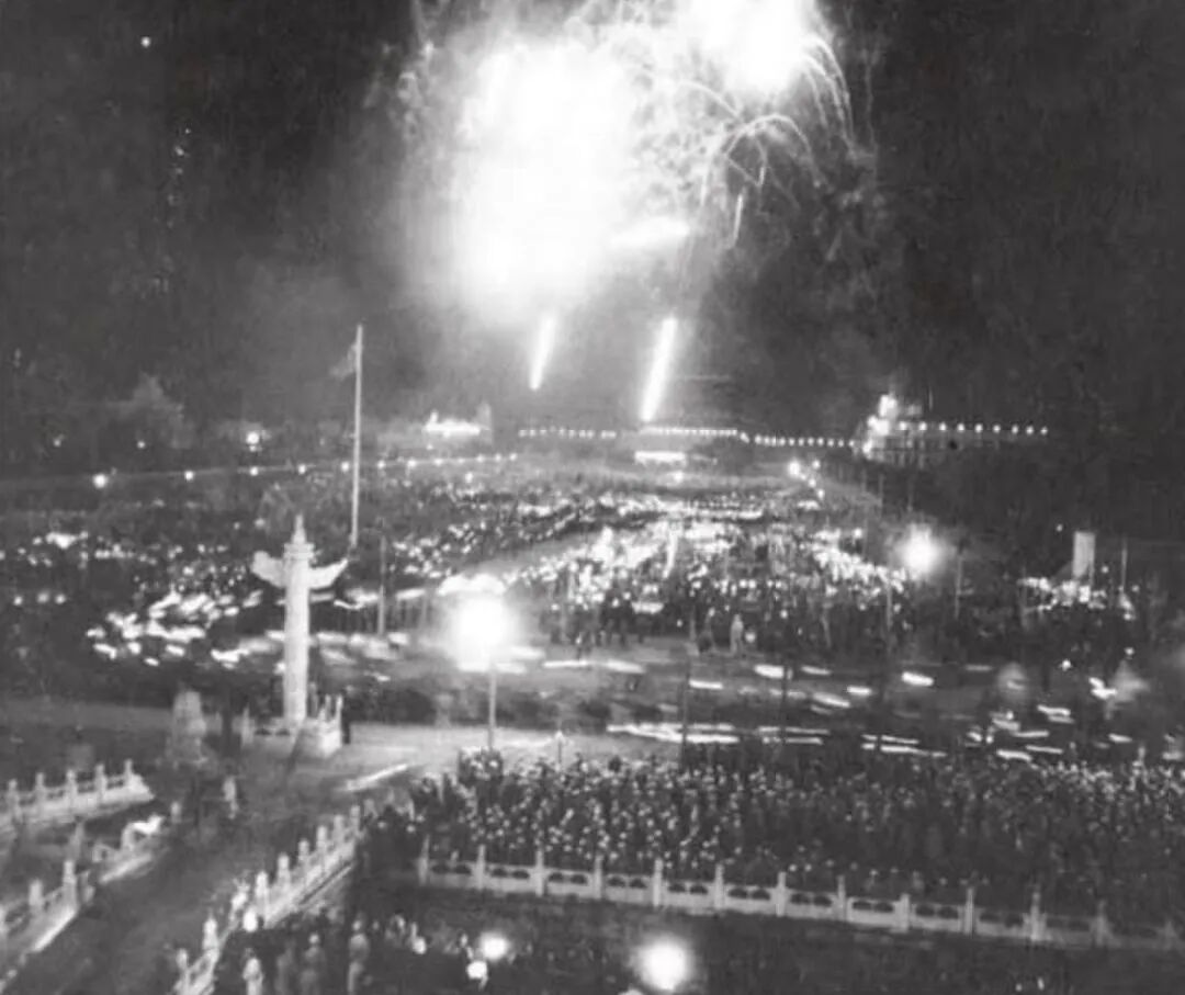 开国大典活动,从下午3时持续到当晚9时。这是傍晚时分,广场上游行的人群。