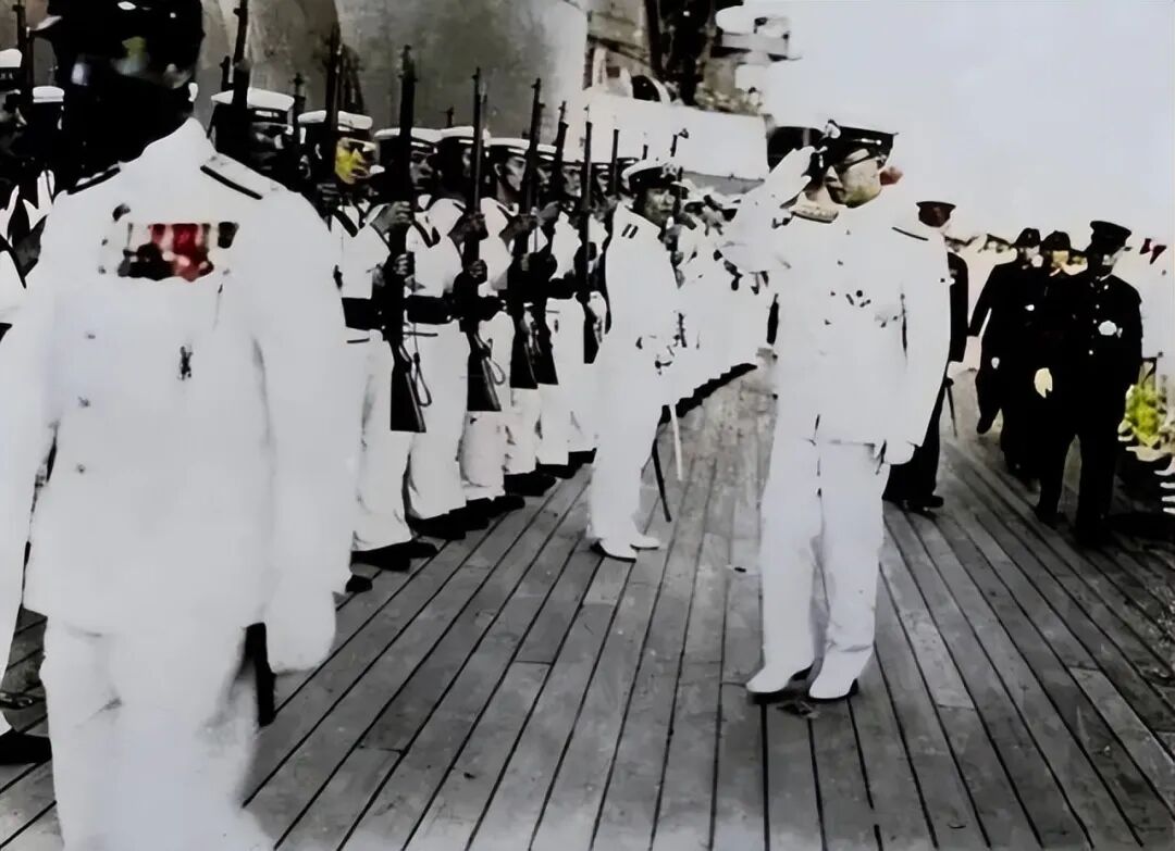 图为,溥仪穿着统帅服在军舰上检阅日本海军 。1935年,“伪满洲”皇帝溥仪第三次登基后,关东军出于“外交礼节”,请溥仪东渡访问大和。