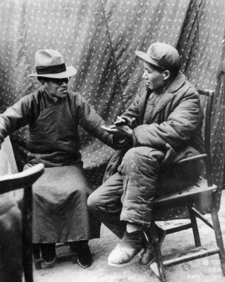 1938年1月,与来访延安的民主人士梁漱溟交谈。