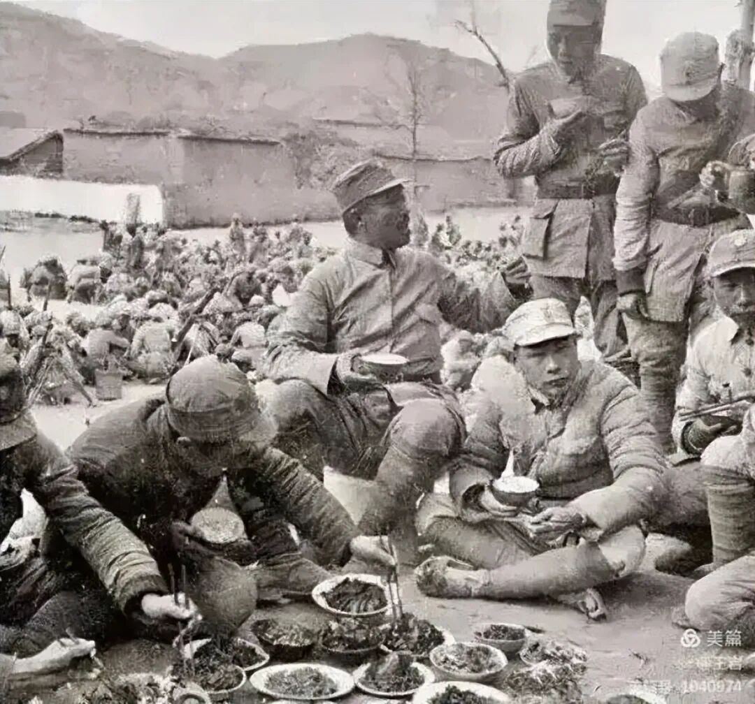这是战后全师会餐庆功的照片,每桌10个菜,官兵席地而坐。