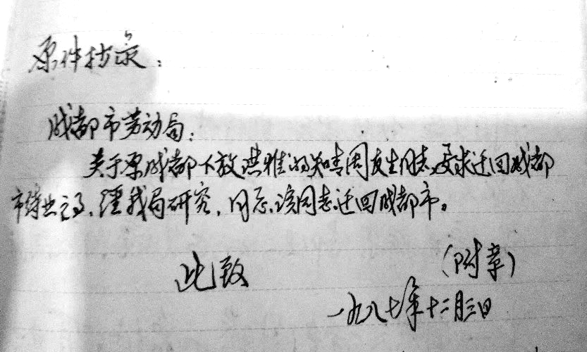 我把自己的这么多年的遭遇写成了书面材料交到了劳动局,于是劳动局派人亲自到洪雅县劳动局对接了解了我的具体情况之后,只需要我答应转回去后不去麻烦任何人的前题下才转回了成都,将户口挂靠在了已经调回成都工作的继父那里。