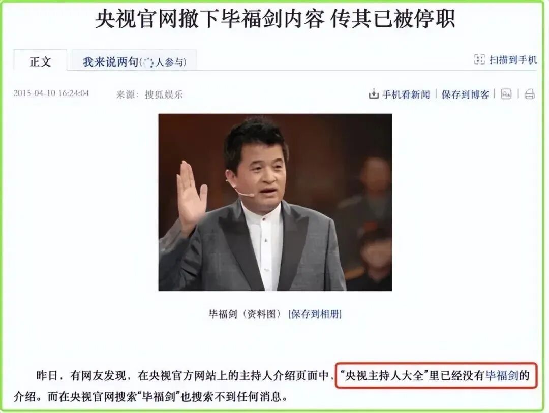 两天后,央视官网上已经找不到毕福剑的信息,而他主持的《星光大道》也因此停播了半个月。