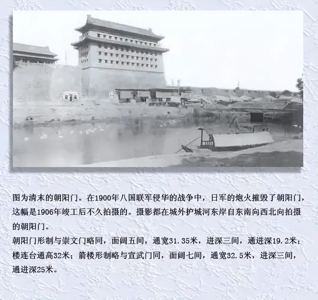 朝阳门,元代称齐化门。通宽31.35米,通深19.2米,通高32米。标志是瓮城门洞上刻有一枝谷穗。它是北京的粮门。通过京杭大运河运来的漕粮,皆由此门入城,存放在朝阳门内的几座大仓库内。瓮城内建有关帝庙,庙里只有神牌而没有神像。1953年拆除城楼,1957年又拆除箭楼。