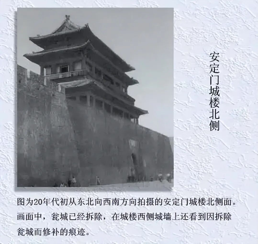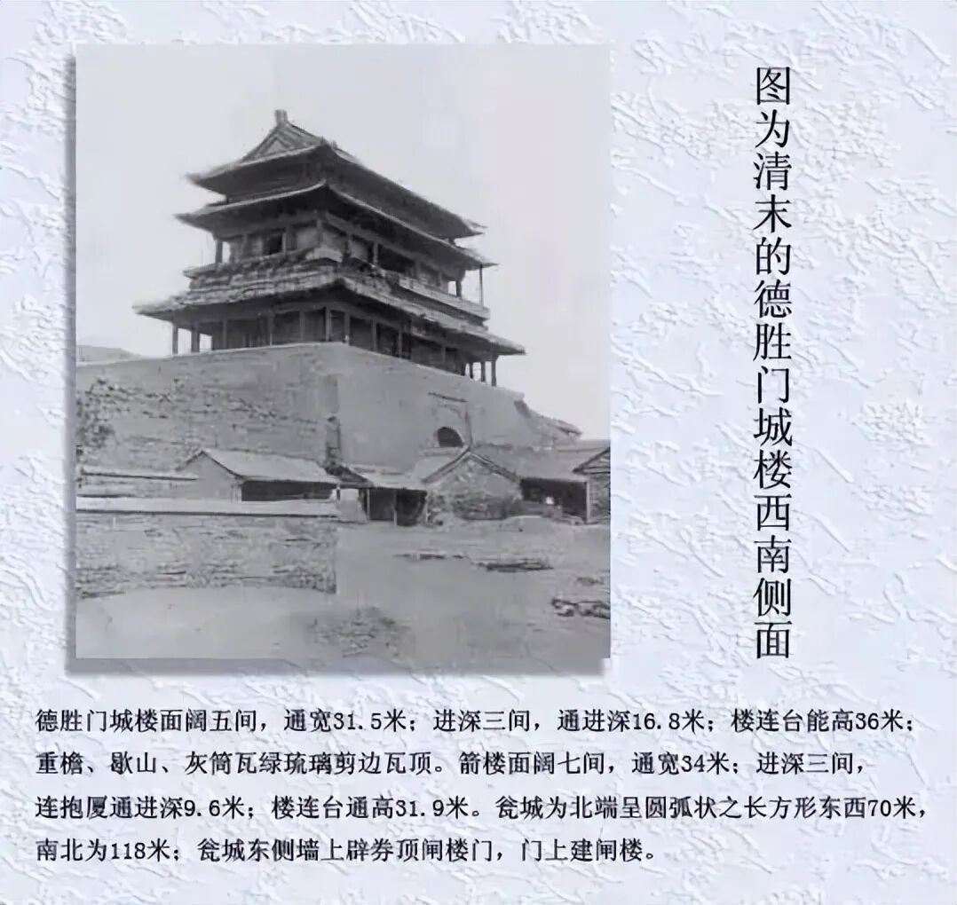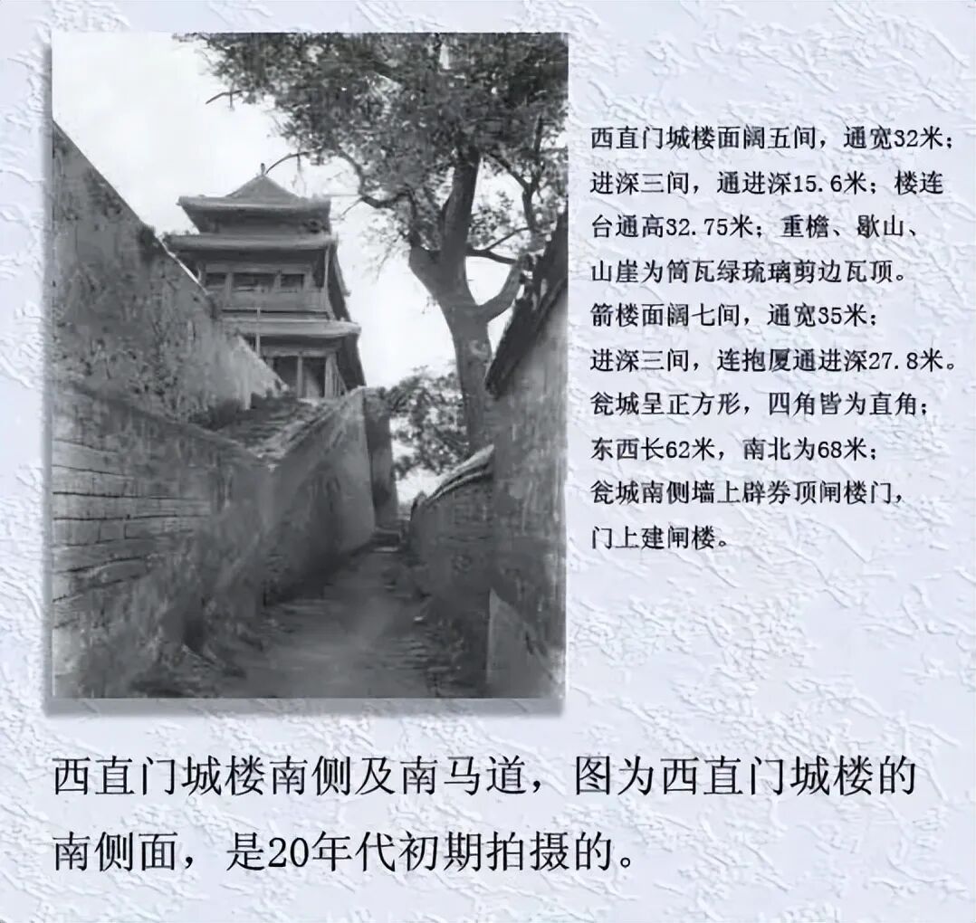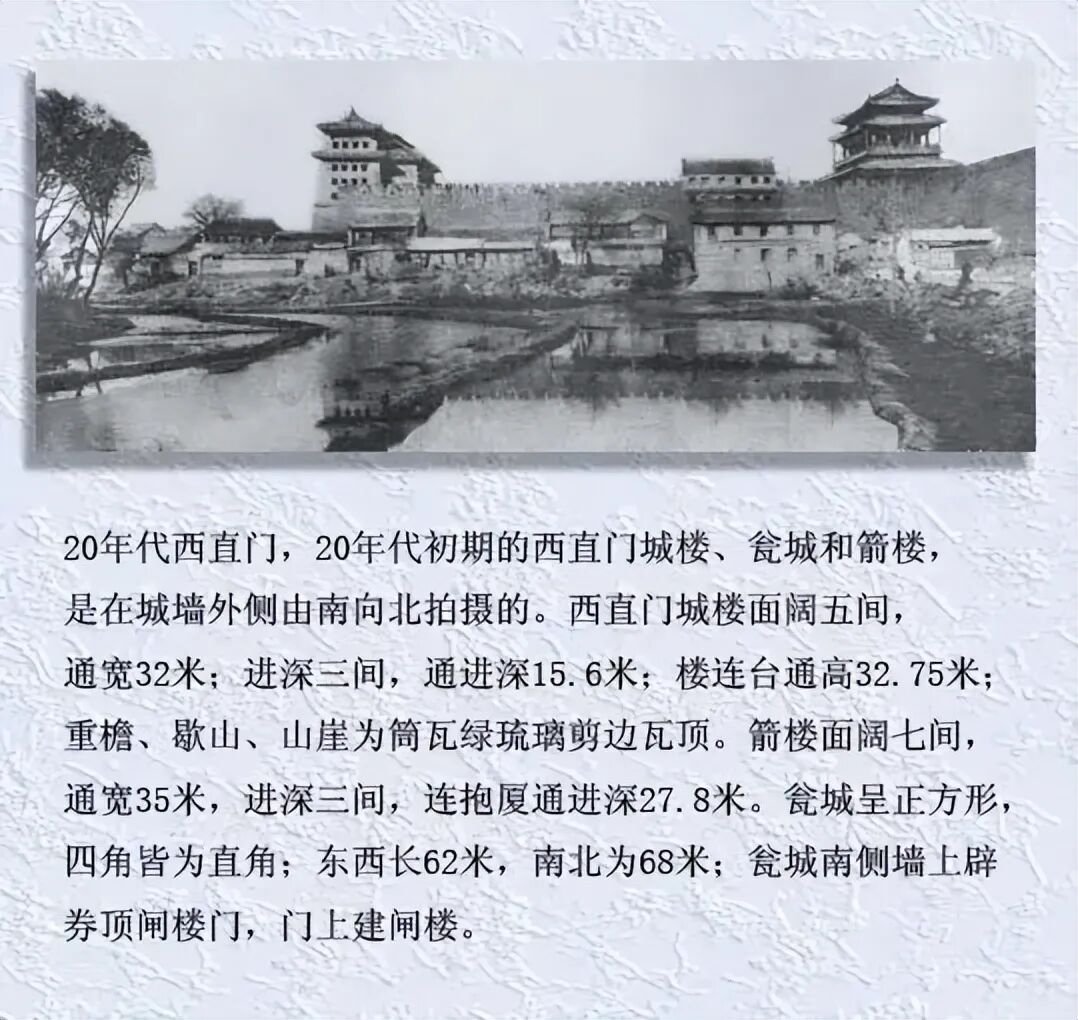 西便门,城楼为单层单歇山小式,灰筒瓦顶,四面开方门,无窗;面阔三间宽11.2米,进深一间深5.5米,高5.2米;其城台正中辟过木方门,楼连城台通高11.2米。瓮城为半圆形,东西宽30米,南北长7.5米。1952年将城楼、箭楼、瓮城一并拆除。