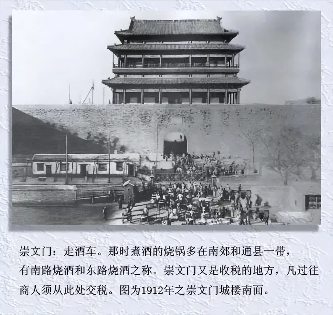 崇文门,元代称文明门。通高35.2米,通宽39.1米。标志是镇海的崇文铁龟。当年它是北京城各门中最繁忙的门。那时北京南郊大兴一带有很多酿酒的作坊,酒车大多由此门进城,所以那会儿有个说法:“崇文门进酒车,宣武门出囚车”。1950年拆掉瓮城,1968年全部拆光。