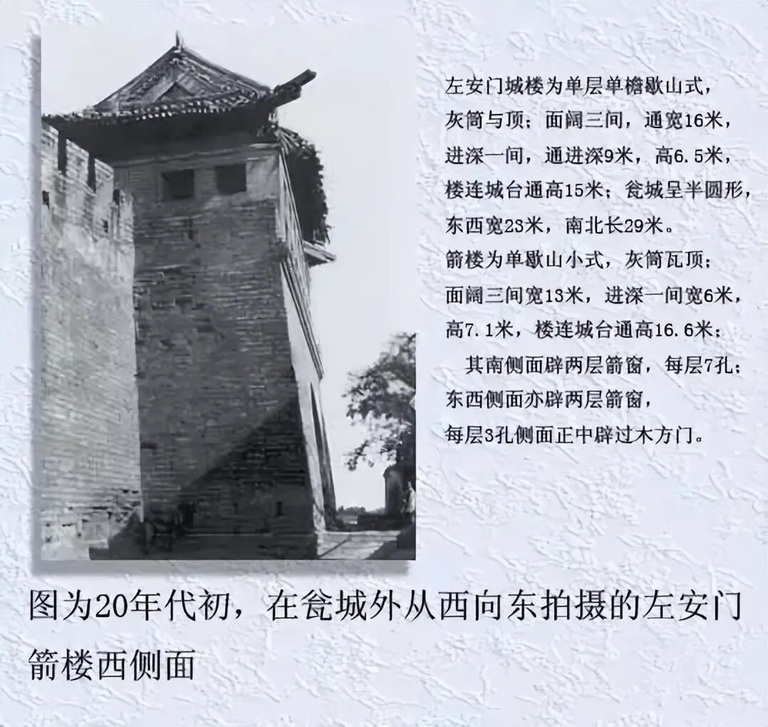 左安门,左安门城楼为单层单檐歇山式,灰筒与顶;面阔三间,通宽16米,进深一间,通进深9米,高6.5米,楼连城台通高15米;瓮城呈半圆形,东西宽23米,南北长29米。箭楼为单歇山小式,灰筒瓦顶;面阔三间宽13米,进深一间宽6米,高7.1米,楼连城台通高16.6米;其南侧面辟两层箭窗,每层7孔;东西侧面亦辟两层箭窗,每层3孔侧面正中辟过木方门。1953年,将城楼、城台、箭楼、瓮城全部拆除。