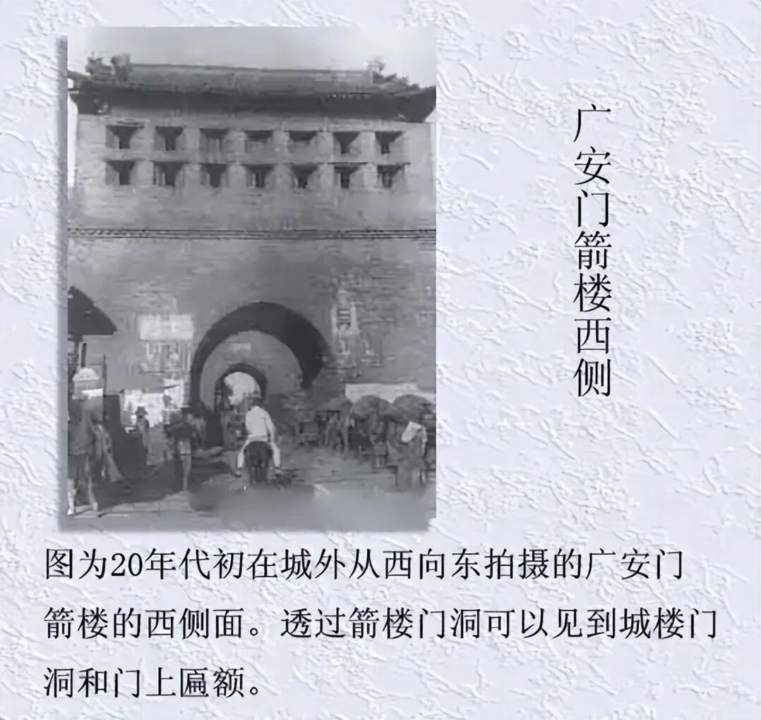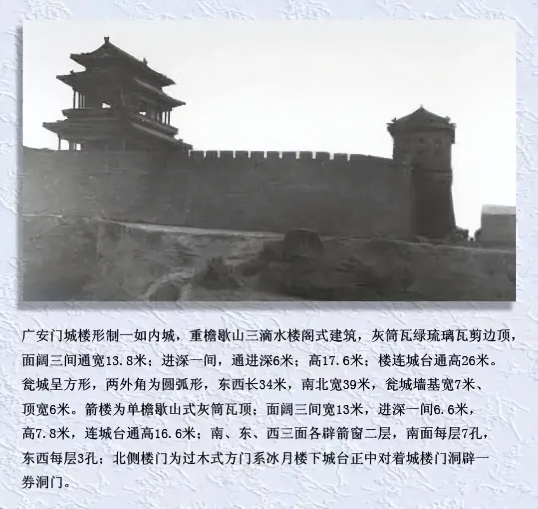 广安门,明代叫广宁门,又叫彰仪门。广安门城楼形制一如内城,重檐歇山三滴水楼阁式建筑,灰筒瓦绿琉璃瓦剪边顶。面阔三间通宽13.8米,进深一间,通深6米;高17.6米。楼连城台通高26米。1957年城楼被拆除(40年代已拆除箭楼及瓮城)。