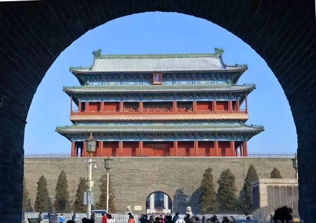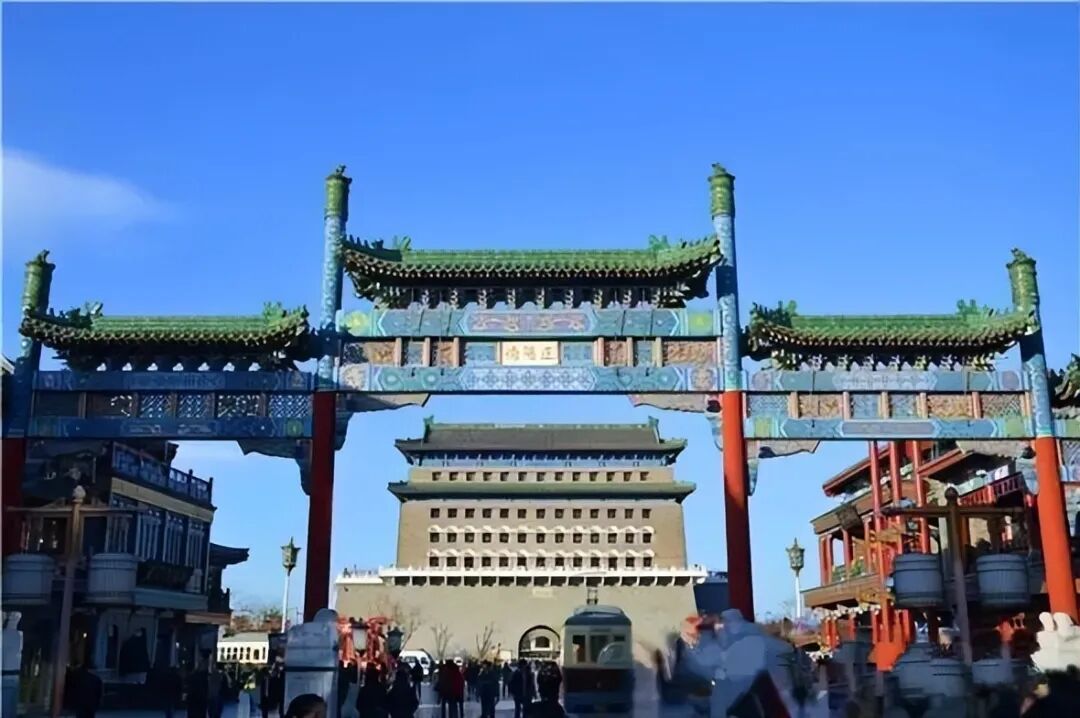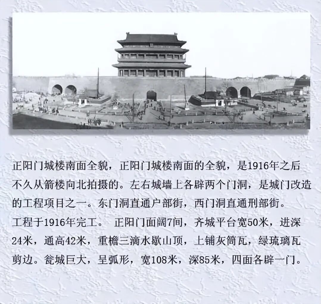 正阳门,元代称丽正门,从离卦中“日月丽乎天”得名,又称前门。标志是瓮城里的金身关帝庙。正阳门位于内城南垣的正中,是皇帝专用的,明朝称大明门,清朝称大清门。除了皇帝,任何人不得从箭楼的正门进出。皇帝每年两次出正阳门,一次是冬季,到天坛祭天,另一次是惊蛰,到先农坛去耕地。1915年为了在正阳门两侧建火车站,雄伟壮观的瓮城被拆除。