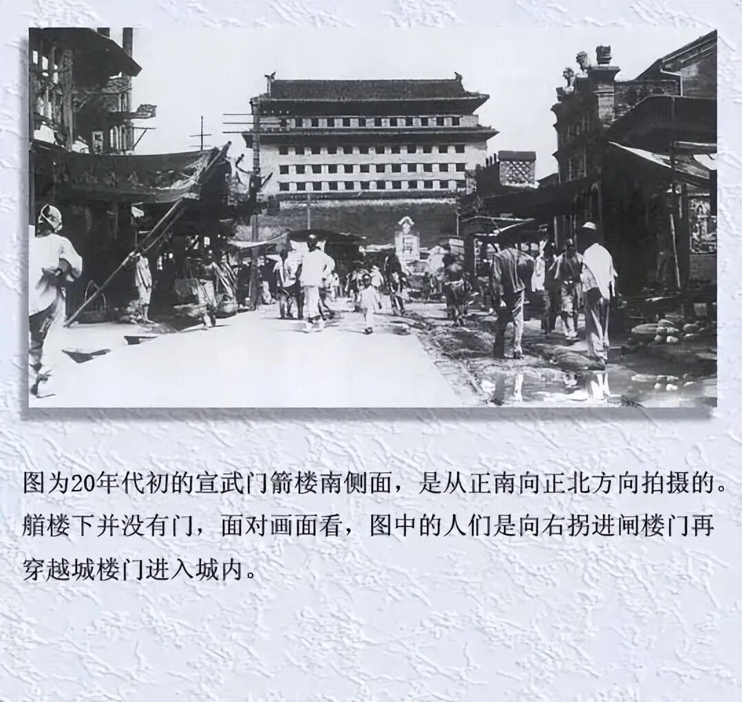 宣武门,元代称顺城门。通宽32.6米,通深23米,通高33米。标志是报时的宣武午炮。多走囚车,也称死门。那会儿墓地都集中在陶然亭一带,送葬的人多走这个门,加上清代的刑场在菜市口,押送死囚的车也走这儿。1965年拆除。