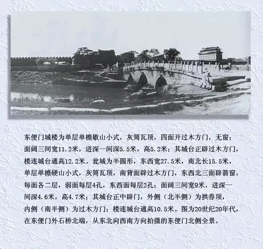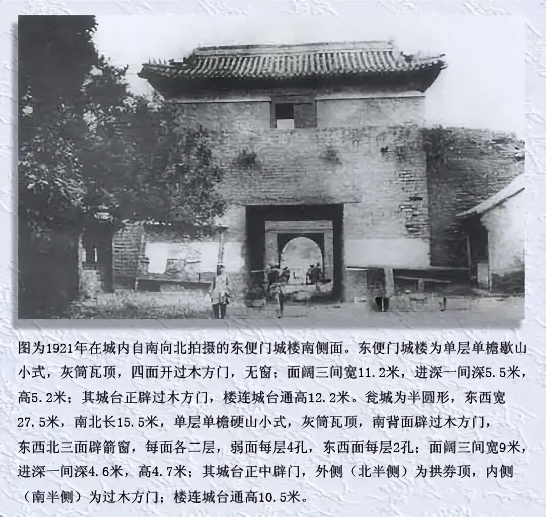 东便门,东便门城楼为单层单檐歇山小式,灰筒瓦顶,四面开过木方门,无窗;面阔三间宽11.2米,进深一间深5.5米,高5.2米;其城台正辟过木方门,楼连城台通高12.2米。瓮城为半圆形,东西宽27.5米,南北长15.5米,单层单檐硬山小式,灰筒瓦顶,南背面辟过木方门,东西北三面辟箭窗,每面各二层,弱面每层4孔,东西面每层2孔;面阔三间宽9米,进深一间深4.6米,高4.7米;其城台正中辟门,外侧(北半侧)为拱券顶,内侧(南半侧)为过木方门;楼连城台通高10.5米。