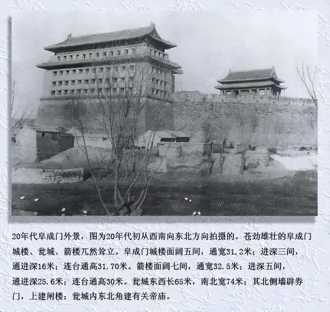 阜成门,元代称平则门。通宽31.2米,通深16米,通高31.7米。标志是瓮城墙壁上刻着一朵梅花。西山门头沟产煤,此门距西山最近,故煤车都走此门。因为“煤”与“梅”同音,老年间有“阜城梅花报春暖”一说。1953年拆除瓮城、箭楼台基(箭楼40年代拆除),1965年拆除其城楼。