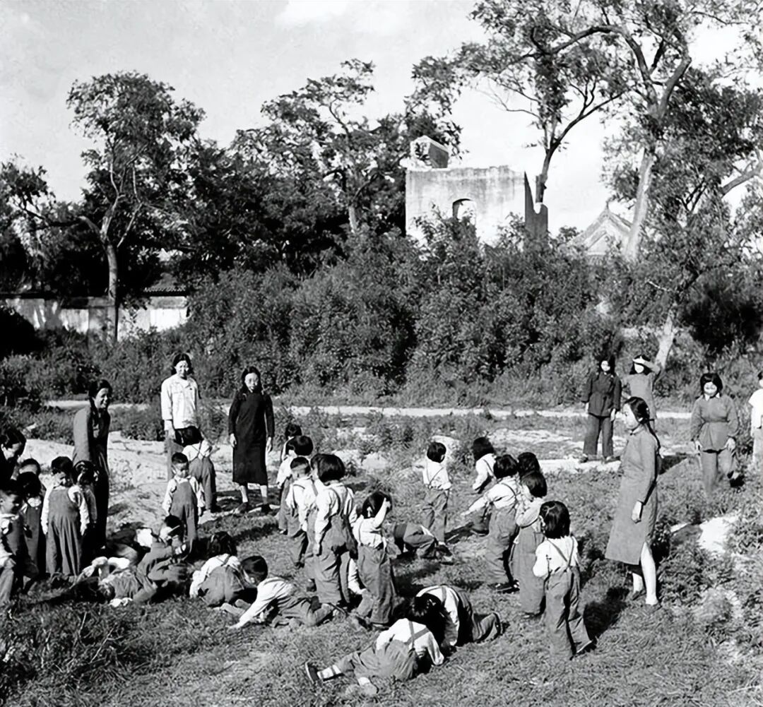 1954年的初秋,北京城的阳光和暖,刚创办不久的培新幼儿园,保育员正带着一群小朋友们在草坪上唱歌做游戏。