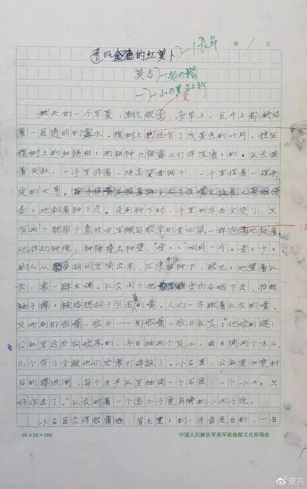 而解放军文艺学院文学系的学生莫言用三天写出了他的成名作《透明的红萝卜》。