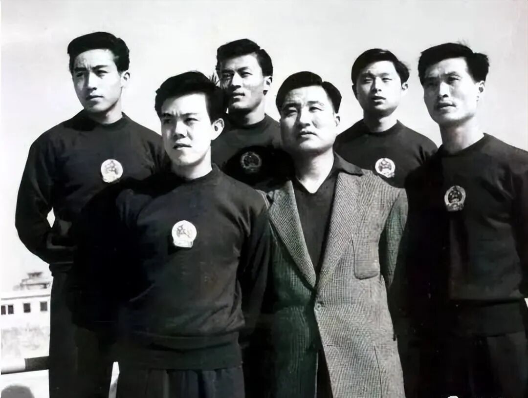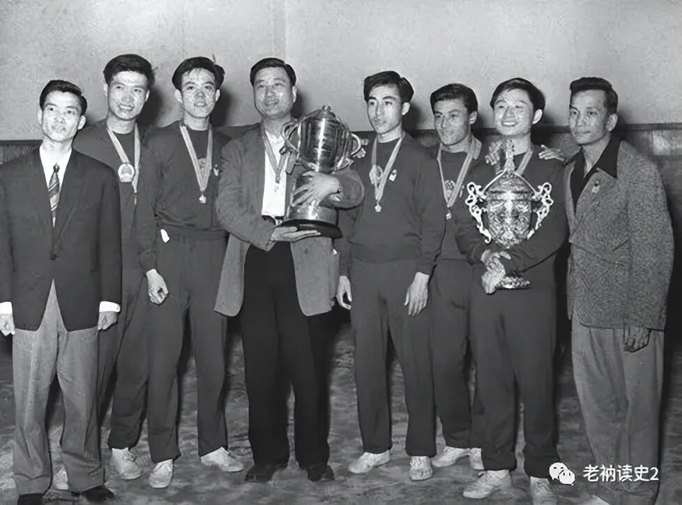 1961年,第26届世乒赛在北京举行,中国男队获得男子团体冠军。左起:梁友能、王传耀、容国团、傅其芳、庄则栋、李富荣、徐寅生、姜永宁
