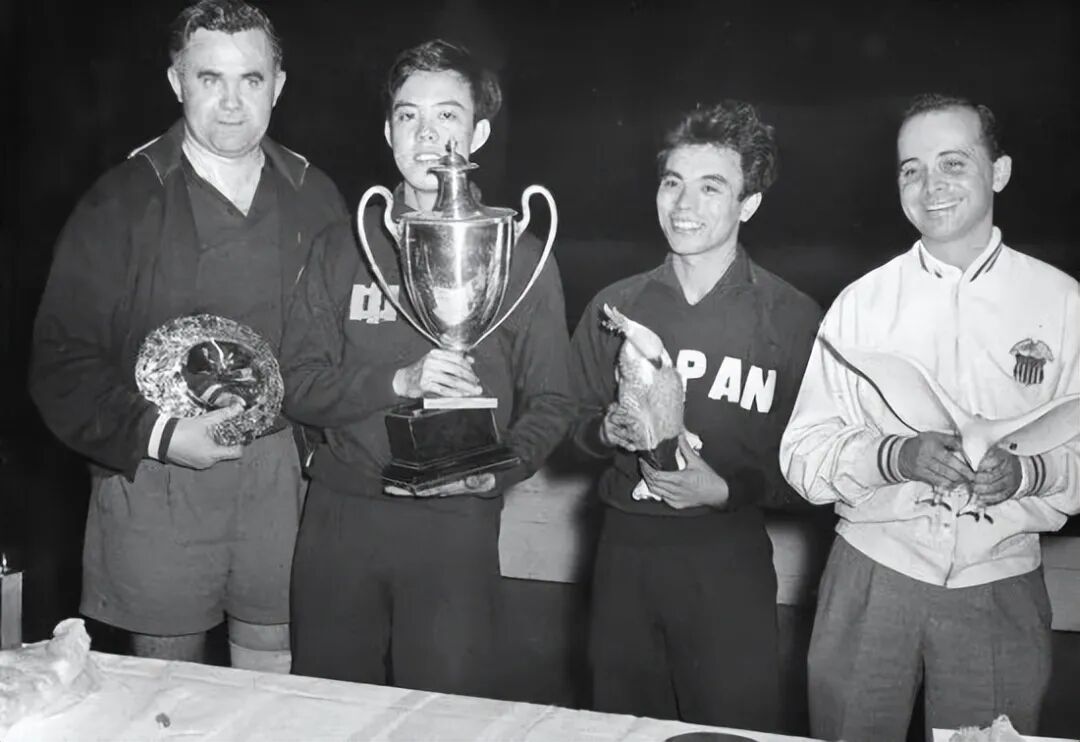 1959年第25届世界乒乓球锦标赛男子单打冠军、中国选手容国团(左2)和亚军、匈牙利选手西多(左)等合影