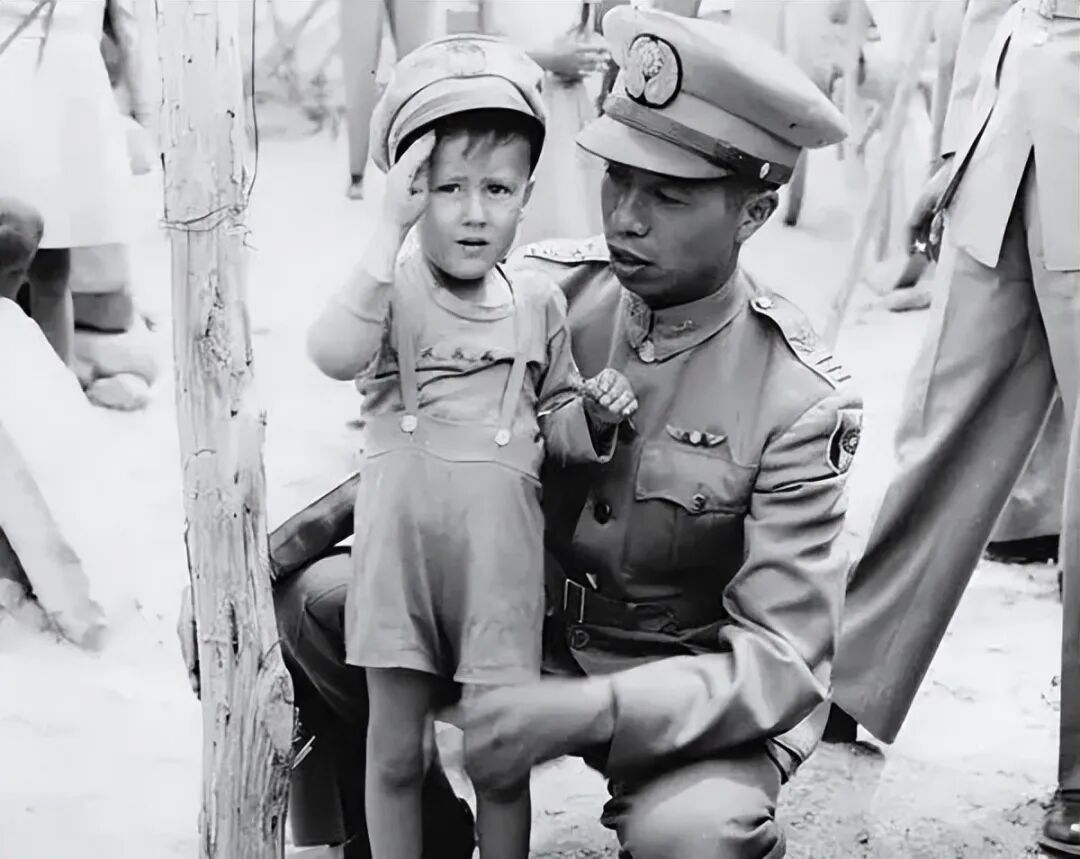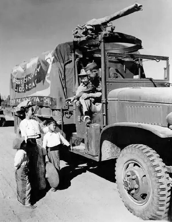1945年2月2日,中美车队的卡车司机在驶出密支那时,向一位缅甸母亲和她的孩子致敬。