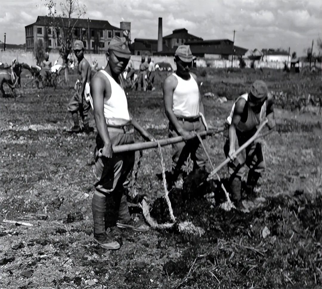 1945年9月29日,上海附近无人看守的日军战俘营里,等待船只回国的日本战俘在劳动。