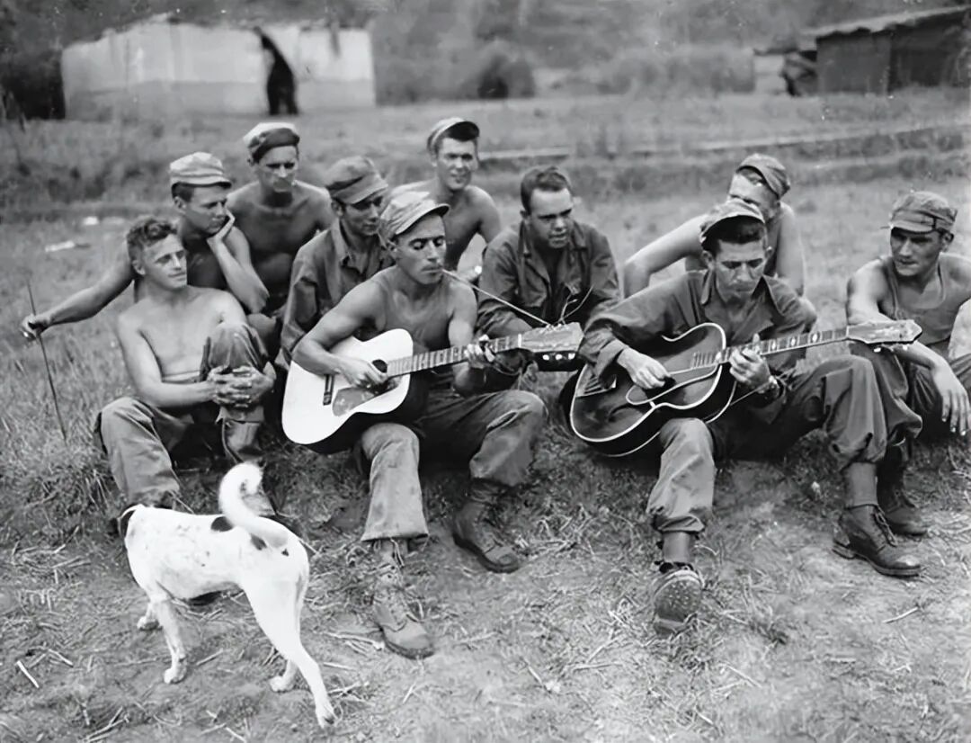1945年4月12日,缅甸腊戍附近,美军第49野战外科医生享受着美妙的音乐娱乐。美军通信兵Signal Corps/摄。
