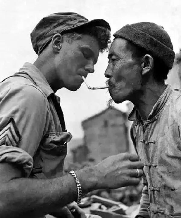 1944年10月14日,一位年长的中国男人在满目疮痍的腾冲街头停下来,向一名美军军士借火,点燃他的烟。美军通信兵Signal Corps/摄。