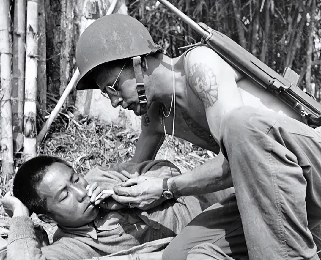 1944年3月31日,在缅甸北部的胡康河谷,一名美军士兵弯下腰来给一名中国伤员点燃香烟。