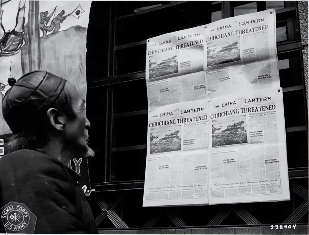 中国昆明,一位老者正目光聚焦在中国战区的官方报纸上,头条标题报道日本军队继续威胁进攻中国腹地。