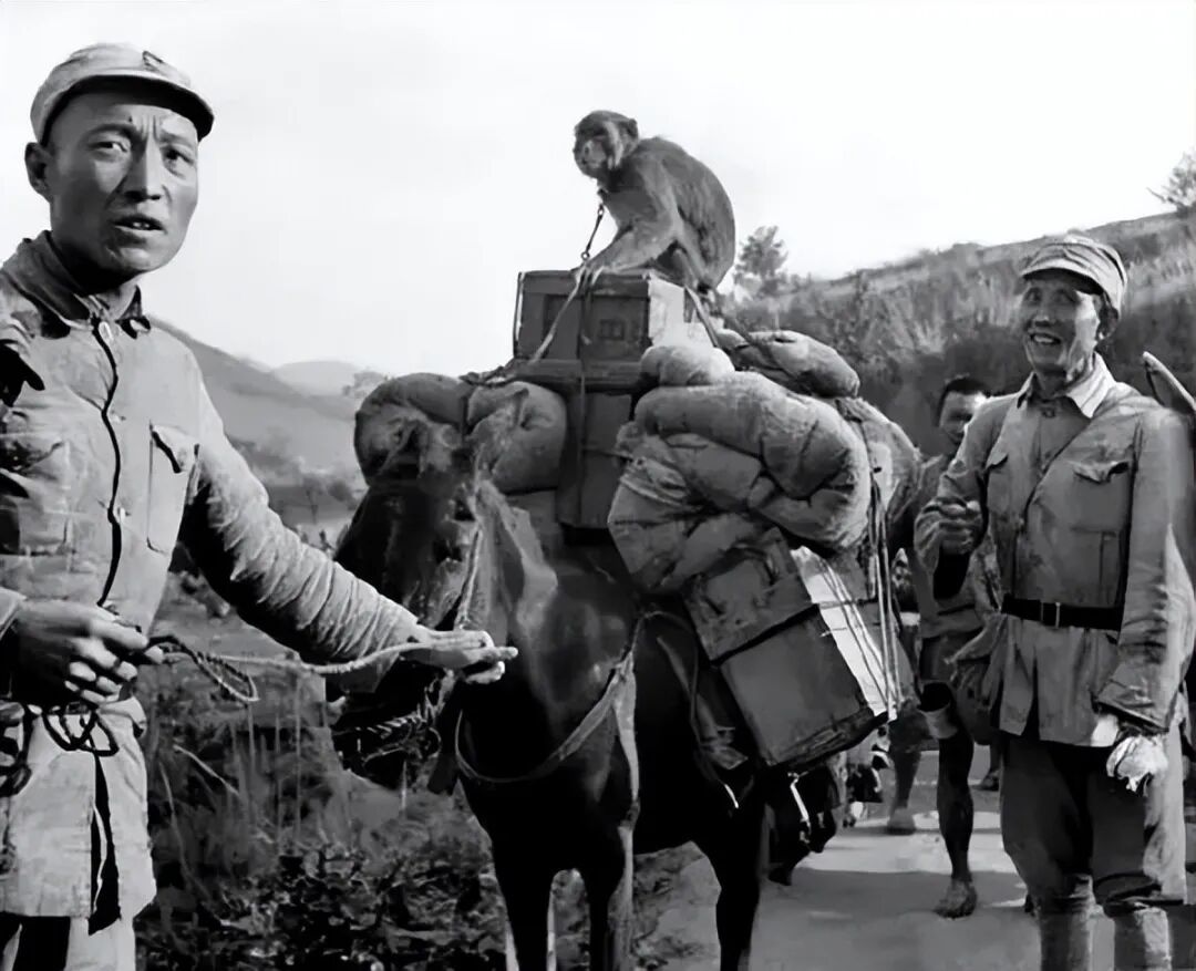 1944年7月10日,士兵们带上他们的宠物猴,放在为前线运输武器给养的骡马背上。