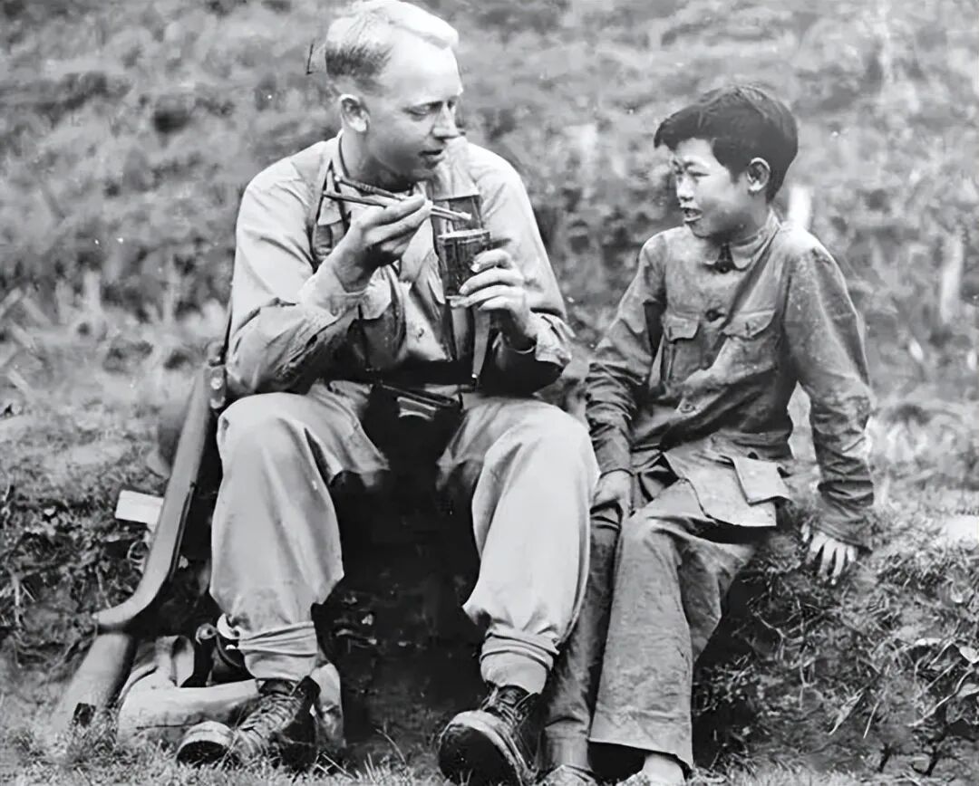 1944年5月6日,来自北达科他州的通信兵亚瑟·海吉用中国筷子吃他的美国干粮,身旁的小孩李田右在教他使用筷子。