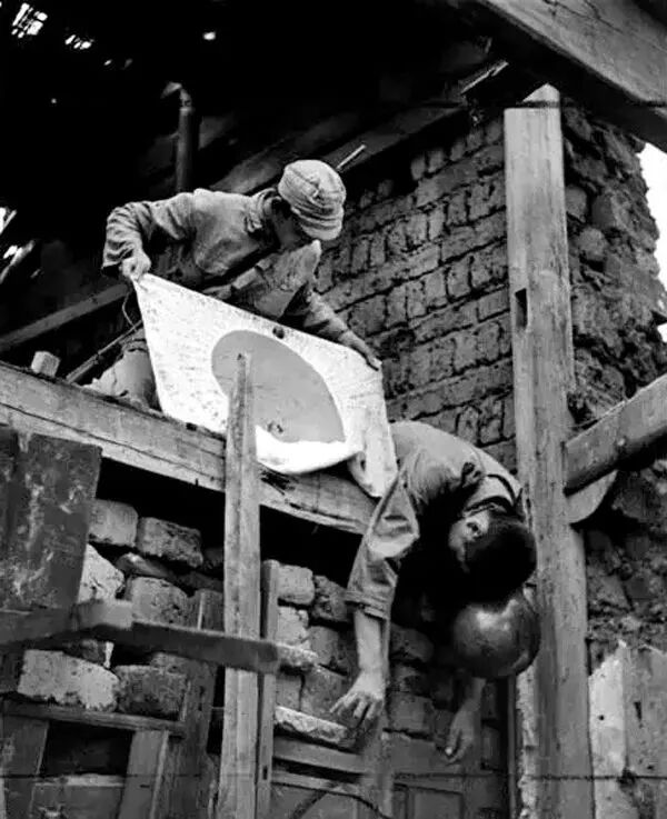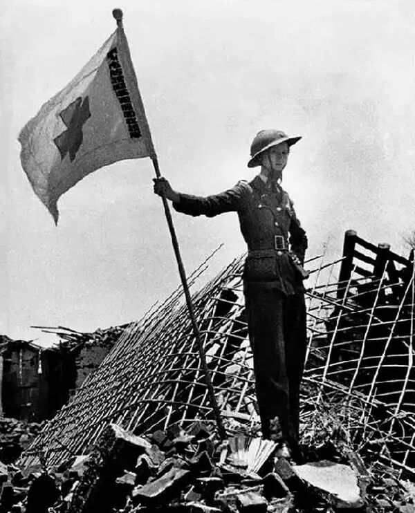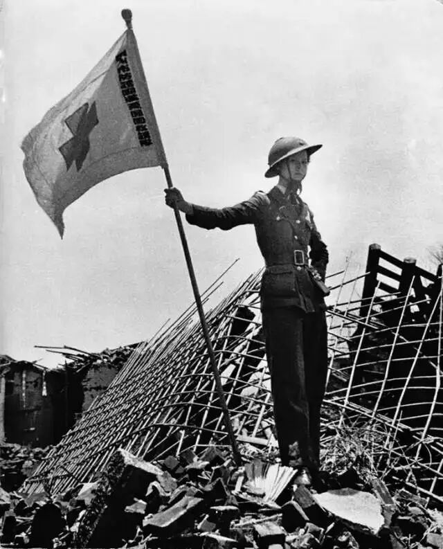 1944年左右,这位紧急救护队的女学生在被炸毁的房屋废墟上,竖起了红十字会的标准 旗帜。