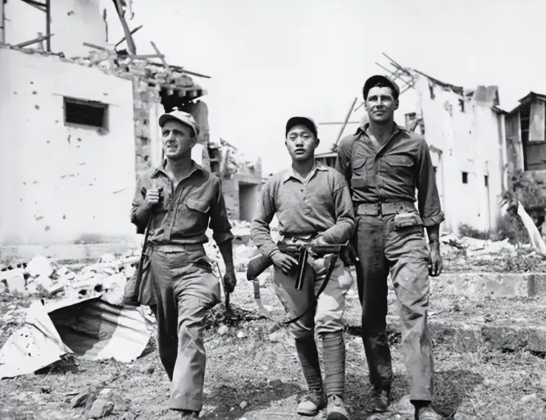 1945年3月15日,华盛顿的杰拉尔德·克瑞甘上尉以及弗吉尼亚州的霍华德·格里高里上尉,与他们的中国朋友正一起从缅甸腊戍的废墟走出来。美军通信兵Signal Corps/摄。