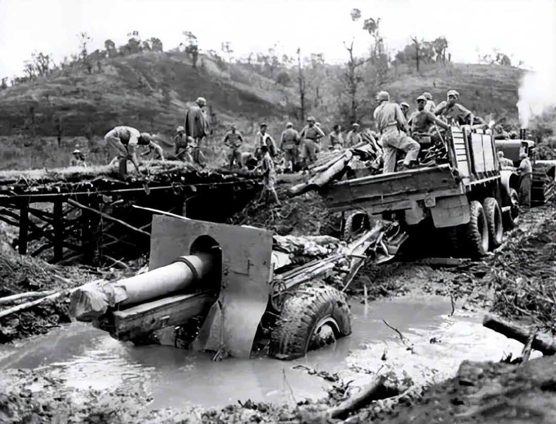 1945年2月15日,在缅甸腊戍以北55英里处,第2炮兵连的一门155毫米榴弹炮陷入溪流,找来一台卡车拖拽。