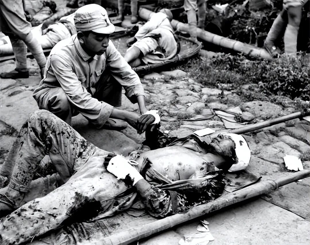 1944年10月4日,血腥的腾冲之战,躺在担架上的中国伤兵。